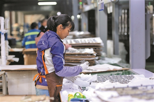 在柳州久誠金屬表面處理有限公司,工人下線電鍍好的汽車配件,準備裝箱運走。